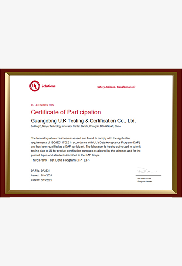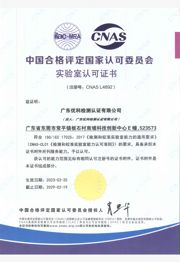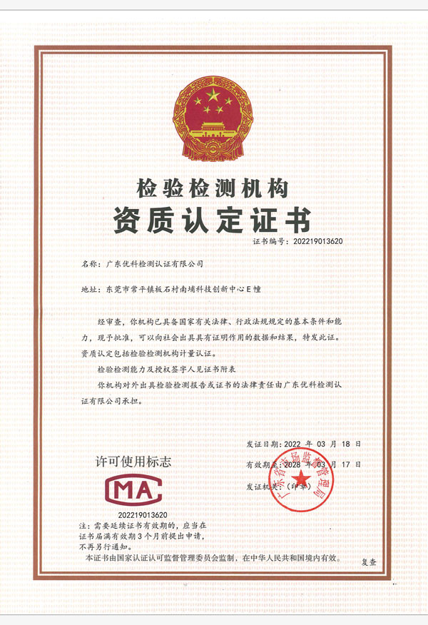 廣東優(yōu)科檢測(cè)認(rèn)證有限公司(簡(jiǎn)稱(chēng):UKK)成?于2007年,是國(guó)內(nèi)專(zhuān)業(yè)的汽車(chē)整車(chē)及零部件、電子元器件第三方檢測(cè)實(shí)驗(yàn)室,國(guó)家級(jí)中小企業(yè)公共(技術(shù))服務(wù)示范平臺(tái),獲得了國(guó)家?新技術(shù)企業(yè)、廣東省專(zhuān)精特新中小企業(yè)、市級(jí)工程技術(shù)研發(fā)中心等榮譽(yù)稱(chēng)號(hào)。 More